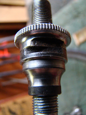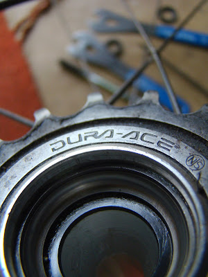 The night before last I took apart the rear Dura Ace hub on my work bike because the day before on the stay alive home I noticed something like lateral lub dub. When I would grab the bike and the wheel would hit the ground there was a looseness of a few mil on each side. On the inside there was no grease left, just black grit and hopelessly dry bearings. So sitting on a stool in the barn I set out the axle, bearings and cone/jam that I had just undone. Next was to clean all spotless and inspect for damage. A couple of the bearings had some slight abnormalities that I ignored for I could not find any new of the right size in my stash. Note to self: Next time you are at the shop pick up some new rear hub bearings. New grease in the races, bearings placed in and appear to be sitting in butter. Axel through, threaded cone race next then the jam nut. Tighten finger tight then apply the 14mm and 15mm cone wrenches, twist with the feel of the right amount of pressure. First not tight enough, slightly loose axle, then perfect free rolling with out compromise.....