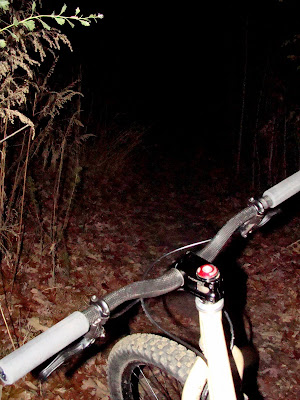 Yesterday afternoon after commute home I loaded up the truck and headed over to Ultimate Bike in Mathews to replace my dead rear tire, the Ignitor was flame less and leaking through the worn out sidewall. I love bothering the shop for something as simple as a tire change, see they have this really nifty compressor that I'm told will not blow the tire off the rim. That compressor is essential for the installation of the tubeless idea or I could blow a dozen CO2's at the barn and be so frustrated that I kick the dog. Just kidding, even though I may want to after not being able to install my tire I would never kick the dog. I brought 2 pre-used tires that were hanging in the barn, a 2.3 Rampage and a different Ignitor. Rampage first choice, hole in sidewall after pouring some Stan's in, dammit. Trashed. Ignitor, yes Rick another hole in the side wall. Okay, you guys have any new Ignitors in stock, yes, good, I'll buy one. More Stan's fluid in the beautiful new tire and compressed air, pop, pop, pop, over inflate and contentment with the new tread. Doug, have any foam grips, not too expensive? Goody, ESI gray foam grips at a fair price, it is new grip day! Now I am ready to ride and the sun was still out, Keller let's go and get in a quick lap before the group starts at 1830hrs, so we did. We parked at the Church across from Beatty and were rolling towards the trail by 1750hrs. Backwards around in the darkness with the HID on my helmet that the fine folks at the shop let me thrash test. Laughs and shadows, rabbits and gremlins, noises and tricks of the mind playing tricks with perceptions. Second group of lit riders coming towards us near the end backwards or start of the beginning was our group so we turned around and jumped in. More quiet laughs as I listened to either complaining or confusion about recently purchased moving parts. No more gremlins but plenty of shadow movement in the forest. Woo-hoo group picture just before it was over and another meaningful ride with some good people. Thanks Rick(not Rich but thank you as well) for making sure that there is a night ride option in town! Here are the pics, obviously the group photo Rick took is not so bad but look how horrible the ones I took are. I really have to get it together as far as shooting action in the night. Completely sad, I do apologize.