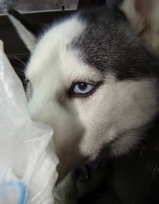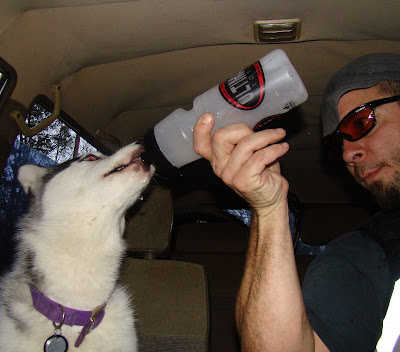 Last night after work ZooZoo and I headed out to the local Single Track for just over an hour PT(physical training)ride/run at her pace. She gets so excited when she sees me loading up the mountain bike equip that she can hardly contain herself. A little howl and some happy dance all the way to the car. On the drive over she calms down a bit and goes to that mental place where she harnesses her internal strength for the game about to take place. Nose in the bag-o-treats.