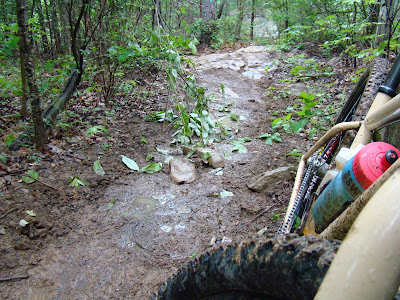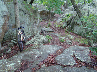 Up the hill on the right split there was a small section of horse damage and then the trail rose slightly. I came to an unmarked intersection and went up left being drawn by this bizarre rock outcrop on top of the wooded hill. There were some neat lines and chutes to ride over and through at this unusual formation.