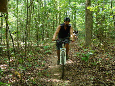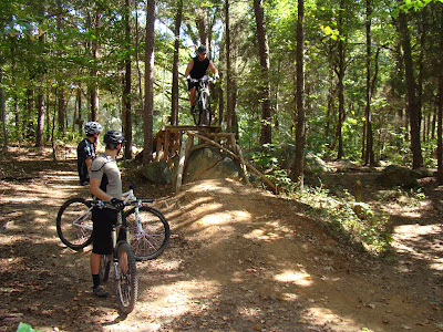 So, hilly spinning and a boring asphalt race against the clock and myself. At 1015hrs a hundred meters before I reached the lot I saw a rider disappear over the jump section towards the start of the trail. I went into the woods too fast from the road transition and almost death launched the big dirt jump down low. Yikes! Once in the trail I stopped for a second and listened for the clamour of 6 fellows mountain biking ahead. At first nothing but then through the trees a faint, "blah, blah, blah, blah, vahvitty, vahhhvityy voo." Bastards. Moving towards them I came upon Eric first who yielded my way without recognizing me. Then Clint said, "Rider Back". Not just any rider, it's me! Our guide Johnny G-Sack led a spectacular ride at PT and good times were had as we toured the entire park at a rest pace. On the last option after the Swamp we rode into Bees or Hornets, a cloud of them swarmed and I was stung thrice. Knee, side stomach and left ass cheek. When the ride was over I made my way back across Cabarrus County and into Mecklenburg for another hour and 55min transfer. The only thing notable about the return ride was the discovery of a huge garbage dump where the over flowing containers from the 'Big Game' were sure to wind up. The American Dream lives deep in us all.