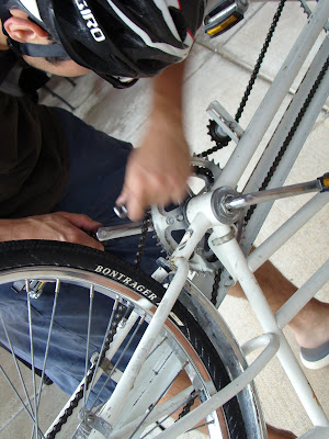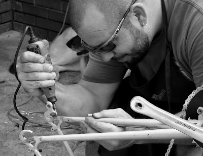 The third most interesting thing that happened this weekend was when James came over on Saturday with his old 5 sizes too big bike and a box of parts that he purchased from Ultimate in Mathews for the conversion build of his new Schwinn. I was expecting it to go down in under 2 hours, everything looked in order and there was nothing that should have caught us by surprise. Within 15 minutes I started sweating and having that strange awkward dizzy feeling in my stomach that I have had before because I realized that steel would need to be cut and I was prolly gonna use my big Ball Peen Hammer more than once. As we all know the Dremel Tool and Hammer are not usually recommended by your local shop but getting this rig rolling was of highest priority, like finding Osama Bin Laden because we all know once we get him the entire world will love us. Anyway there was no pressure but James was really looking forward to having this new ride so we dove into it. I spent 30 minutes before he got here taking the useless gear shifty related parts off and prepping the frame for all the new singly stuff that he had bought. Drive train first. I pulled down a 45 tooth front ring from the collection of rings on the ring hook in the barn and realized that due to a bit of confusion at the shop James did not have the shorty chain ring bolts that I had requested. Chain ring bolts, dammit. James, pass me the hammer please. Through all crap on my bench I was able to piece together 5 small spacers for the back of the 5 regular chain ring bolts. Whew, that was a lot easier than just opening up a pack of new bolts even though it took about 35 minutes longer. Then the dremilling, not once but twice. Pass the hammer again, please James. Now put the new 18 tooth cog and spacers on that pretty wheel. No hammer needed but truing was. Okay, the new quill for the new mountain flat bars and brake levers is an inch and an 8th? Should be an inch right? James, the hammer Por Favor. Somehow we found what we needed in James' box of death to use the old quill from another bike that he had stripped down. 4.5hrs after he arrived at the barn for a sub 2 hour bike build James left happy with his new bicycle. I got a note from him yesterday and he reported that he went out on an 18 mile urban ride around town on Sunday. He wrote, "The bike performed wonderfully." Great glad to hear that and of course a good ride makes our efforts all worth it. He did say that he was almost vomited on by an inebriated Panthers fan who hurled in the road near the stadium. Life is Good!