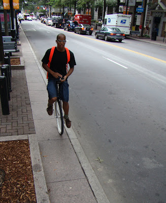 Mike B. with another safe unicycle line up on the curb headed North on Tryon, his vest alerting any on coming drivers, pedestrians, cyclists or crazy messengers with a camera of his presence.