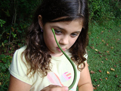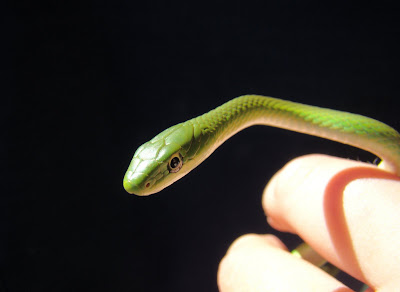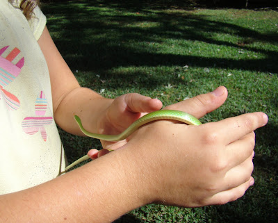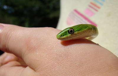 A week or more of straight overcast skies with an occasional shower left no chance for a recreational bike ride this weekend. I guess I do have more utilitarian riding to look forward to in a few hours when the work week commences on commute with or without the atmospheric condition's emotional support. Yesterday when a soggy ride plan fell through things started changing here and fast. Botzie stopped by with his kids, at first to talk tech which led way to a complete smashing volley of Badminton out in the far back. I built the course(court) last week out of a bag that came as a gift a long time ago. Not quite as exciting as being on a bike but the game had its emotional ups and downs that at least reminded me of riding. Chasing the shuttlecock(long for birdie) and striking it hard while trying to place it strategically on the other side became a blurry mission. Sweat in the eyes, short sprint bursts, hitting the ground after diving for it all wrapped up into some sort of fun for kids and adults alike. Once we finished up the Briton version of lawn tennis without a ball we started the walk back to the house for some home made strawberry lemonade. Ms. Arcen and Gracie were behind me when I heard the kids scream, "SNAKE!" Reptile man Botzie jumped in to examine the specimen and without any trepidation reached down and picked up this little green snake and handed it to Ms. Arcen. Immediately after the kid realized that the snake could not physically bite or hurt her they became friends for the rest of the afternoon. I found the creature interesting to photograph and was glad that Jeff was here to give me some pointers on making a few images that would be worthy to post toonday. Here is the essay: