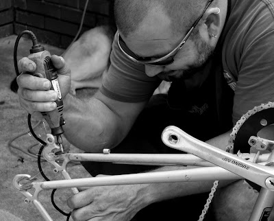 Yes, I am wearing an old K & W Cafeteria Apron and as any wise owl would I am protecting my eyes with the latest version of the Ventoux by Tifosi while I dremel away at the useless steel blocking the full length of the drop. Check out the Sparks.