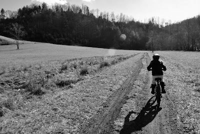 On Friday Morning we left Charlotte early enough and drove for three hours up through Boone and Mountain City Tennessee to the tiny town of Damascus Virginia. The high landscape between NC and TN was covered in a few inches of fresh snow, giving the trees a painted appearance. The road level temps were around 32F in the morning. Once in Damascus we found Sundog outfitters and parked in their lot. The fellow there hooked Ms. Arcen up with a small 26" wheeled Giant mountain bike and within minutes we were packed up and on the van shuttle headed for White Top, 40 minutes away. There were 4 adults and 2 teenagers already on board talking about horses and horse farms near Roanoke.
