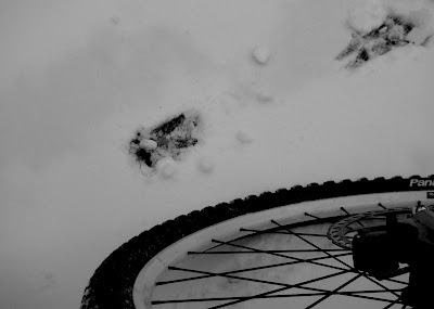 Post my last job Friday afternoon I rolled over to the South End Cool and Cool for an outdoor patio beer with Botzie, Yurgen and the other more original Worm. The snow flakes started around half way through my first beer and after the second I jumped on a slightly further west to east Stay Alive through the big buildings with eyes being sand blasted by the flakes. Now out of all the other every day normal commutes done all the time this one stands out because it had just gotten dark and there was snow flying down out of the sky in between the slow feet forward moving stop sea of tail light traffic jam headed home to the burbs as I was passing twice as fast. I realized that as soon as I got home and dry I needed to prep my mountain bike by switching the 23 to an 18, plus air up the tubeless then pack the pack for a possible early morning snow covered landscape exploration.