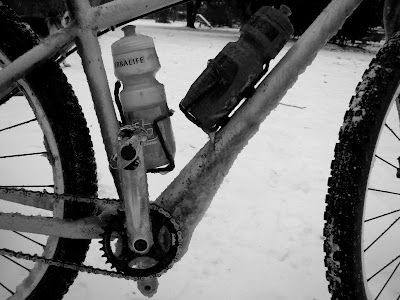 By the time I hit the entrance to the Lake Loop I could not figure out if it had been twenty minutes or two hours since I started the trail portion of my excursion. According to my time piece it had been just under an hour and a half, around about thirty minutes more time than it normally takes to get through the entire 11 mile loop. The Lake Loop offered at least three more crashes before getting to the little big creek crossing dip and out. There were two kids sledding the trail there. They were the only humans other than the mustached CC runner running towards me in the drift that I saw all day. Finally out of there and on my way back to Dooleyville with an apple in hand and mouth pedaling the frozen tundra of Lower Rocky River. The tires crunching different now for the remaining 6 happy lonely miles back to the homestead. I missed the 3.5 hour window by twenty five minutes, the delinquency no doubt caused by the wintry condition of the surface which I never get to see here in Charlotte.