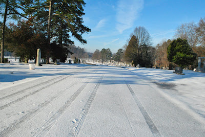 I took this picture on my Monday morning commute in to the Jar. I was in the Cemetery that I cut through almost everyday but I have only seen it look like this one other time. The air was completely dry and cold. Tires rolling against the surface made a continuous soft purring sound. I had to avoid the hard frozen ice ripples on sections of the sidewalk on Lawyers, Albermarle and Central. In the neighborhood connections that take up the majority of my inbound Stay Alive the surface although frozen was smooth covered in a dust of blown snow. Just another commute by bike but a memorable one because of the winter implications. Because of the surface conditions my time in to work Monday morning was roughly ten minutes longer than the normal.