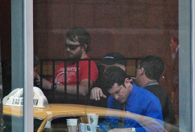 C. Listening to Bike Shop Girl's interview with Marla Streb Podcast #4 on the strange futuristic blue tooth wrap around thing plugged into his skull halo style that is connected without wires to his crackberry hand held transmitter sitting on the table to his right.