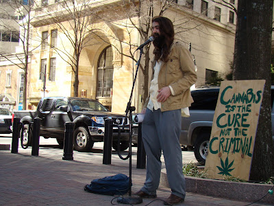 Recently I rolled up to a red light on the square and saw this tall hippie like individual setting up his terrific platform within eight feet of the sidewalk. I jumped off the bike and tried to figure out exactly what I was seeing. As it turns out Mecklenburg's Marijuana Messiah was standing tall with a message for anyone listening and all six of his Face Book friends who showed up after clicking yes to the invite to join the Cannabis Reform Rally on the Square. This Pro-Pot forum was trying slowly to convey the importance of legalizing or at the least decriminalising the possession of the Marijuana plant in any form. His message came out peacefully in a drawn out hippie tone. At one point one of those in attendance stepped forward, interrupted the weed guy's speech and then challenged him that his argument was all wrong. This guy was way louder than the Pot Prophet and seemed aggressive no doubt the outcome of his ranch covered roast beef breakfast and lunch. The unnamed individual seemed to know more about the reasons that pot should be legal and then he basically took over the agenda of the rally to the cheers of the small group. I stuck around for a few minutes to ask some questions of folks in the overwhelming crowd of six. Fortunately I had to get back to work and I did not have the chance to see how the rally ended. What a hoot indeed, I love my job.