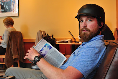 VeloCity's CEO, COO, CFO, CLO, CMO, CWO and CCO kicks back with his 18th cup of Pike for the day as he peruses a Manga Anime Magazine that he bought on a recent trip to Tokyo while attending a Global Anime Convention. The helmet protects his brain when he unexpectedly falls out of the chair and onto the hard tile floor. Nothing says safety like a Bern!