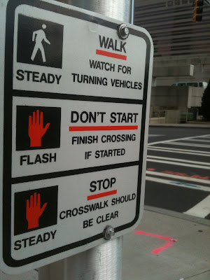 Hmmm, at the very entrance to the crosswalk where this bicycle v. car altercation went down there is a stark warning posted on the inside light pole. This could be a crucial piece of evidence in the case, or maybe not.