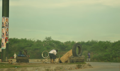 On one of my day trips last week I rode visual shotgun in Pastor Lyonel's truck out to a small town(Babancourt) of about 4,500 in the vibrant green country side an hour and fifteen minutes north and west of the capital city. In an effort to keep me on my toes, Pastor Lyonel drove us right through De Cite Soleil, one of the U.S. State Department tagged RED Zones(U.S. Citizens STAY OUT) in the PAP area. The road into and out of De Cite Soleil, or The City of Sun is a variously surfaced narrow road that has a moderate amount of all types of vehicle traffic traveling way too fast to give the road any chance of being considered pedestrian friendly.