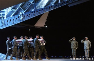 A Marine carry team moves a transfer case containing the remains of Cpl. Lucas T. Pyeatt, late on Feb. 7, 2011 at Dover Air Force Base, Del. (AP Photo/Steve Ruark)