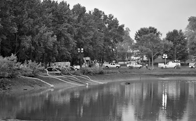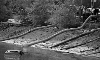 The dam draining seemed to be winding down, the big motors went silent. I rode around to the west bank of the lake and talked to a few folks from the press corps, including a familiar staff photographer from the Observer. This photographer who will remain anonymous for the time being or until you use your intuitive deductions skills, asked me if I had rode all the way from the big buildings just to get a shot of the car. I gave him the brief organic explanation about my daily commute which made him smile and almost start to laugh. When I asked him about the scoop on the car, he told me that the bigger story was that the pumps continuously stopped working through the night. "Yeah", he said, "One of the engineers told me that the big pipes draining the lake kept getting clogged up which caused the motors down to shut down often. Apparently there were 25 years worth of condoms in the lake that were jamming the pipes." Oh, I get it, you are making a dam joke. Very funny.
