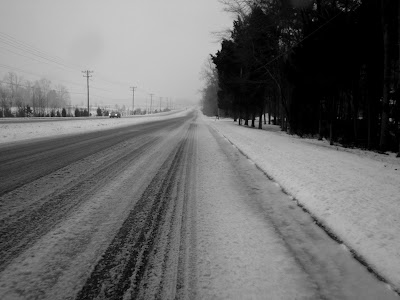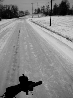 As soon as I turned left out of the drive I intuitively had a flash that this was going to be more difficult than I originally considered. Through the gray snow covered morning quiet neighborhood, nobs and ice pellet weighted down snow made resistance friction. A bit of roll on downward slopes however none on the flats and even less as the terrain rose. Out on Albermarle Road headed east the wind was coming from across my left to right and was sometimes at my back. Great, it will be in my face later. Normally there is but today there was no sidewalk covered in deeper than pedalling could overcome ice and snow plus the plow wake. Because of the absence of the auto viper I was able to just take a snow slush lane frozen in spots on HWY24/27 with my mountain bike, insane.