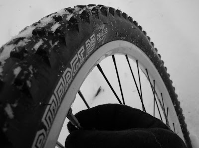 Post my last job Friday afternoon I rolled over to the South End Cool and Cool for an outdoor patio beer with Botzie, Yurgen and the other more original Worm. The snow flakes started around half way through my first beer and after the second I jumped on a slightly further west to east Stay Alive through the big buildings with eyes being sand blasted by the flakes. Now out of all the other every day normal commutes done all the time this one stands out because it had just gotten dark and there was snow flying down out of the sky in between the slow feet forward moving stop sea of tail light traffic jam headed home to the burbs as I was passing twice as fast. I realized that as soon as I got home and dry I needed to prep my mountain bike by switching the 23 to an 18, plus air up the tubeless then pack the pack for a possible early morning snow covered landscape exploration.